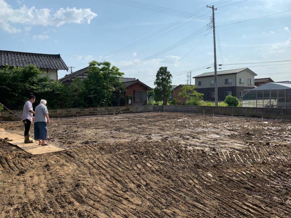 新潟市の建替え工事、既存住宅の解体が完了しました。 大きな住宅なので、重機を投入してから5日間かかりました。 地面もきれいに均し、更地になり、新しい住宅の工事が始まります。 まずは、地縄張りです。 地縄張りとは、工事着工の最初の作業で、建築予定地に縄を張って、設計図通りに建物の位置を決めていく作業のことです。 木造建築独自の過程で、建物の外周と、内部の主な部屋予定スペースの中心線上に縄やビニールひもを張り、建物位置を地面に表し、角々には地杭を打ち、垂直を出していきます。 この後、地盤調査し、建物の不動沈下を防ぐための地盤改良へと進みます。 ご質問、お問い合わせの方は、インスタグラム、LINEでどうぞ。 IDは、shizenhalife01です。