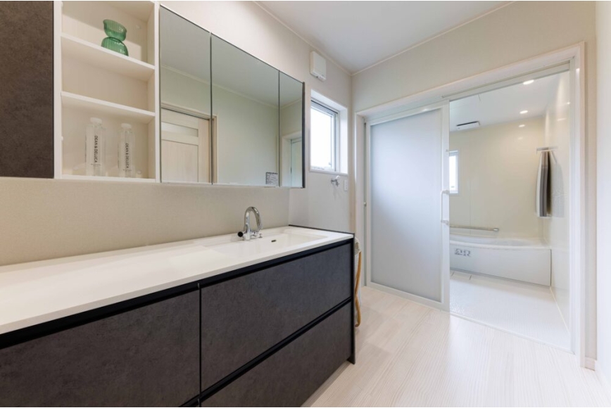 ●洗面脱衣室を広くして、物干しスペースを確保し、室内干しができるようにする