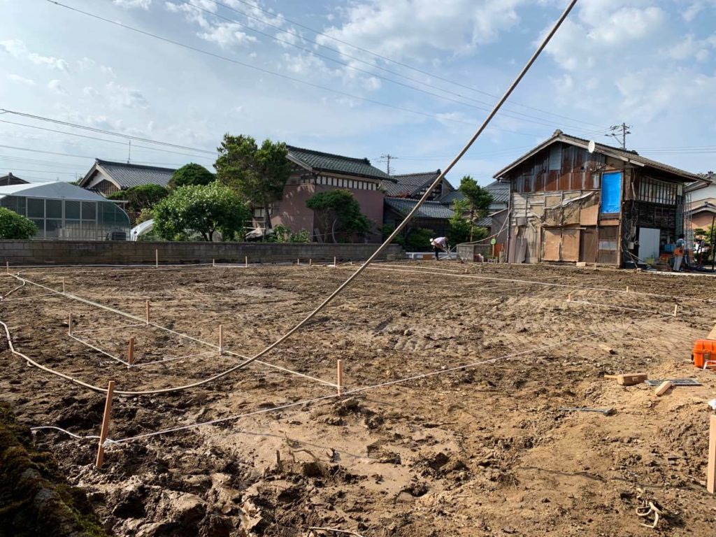 木造建築独自の過程で、建物の外周と、内部の主な部屋予定スペースの中心線上に縄やビニールひもを張り、建物位置を地面に表し、角々には地杭を打ち、垂直を出していきます。