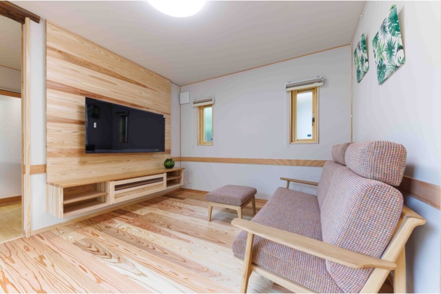 ●杉うづくり無垢の床材を多用し、暖かさ、涼しさ、足触りを良くする