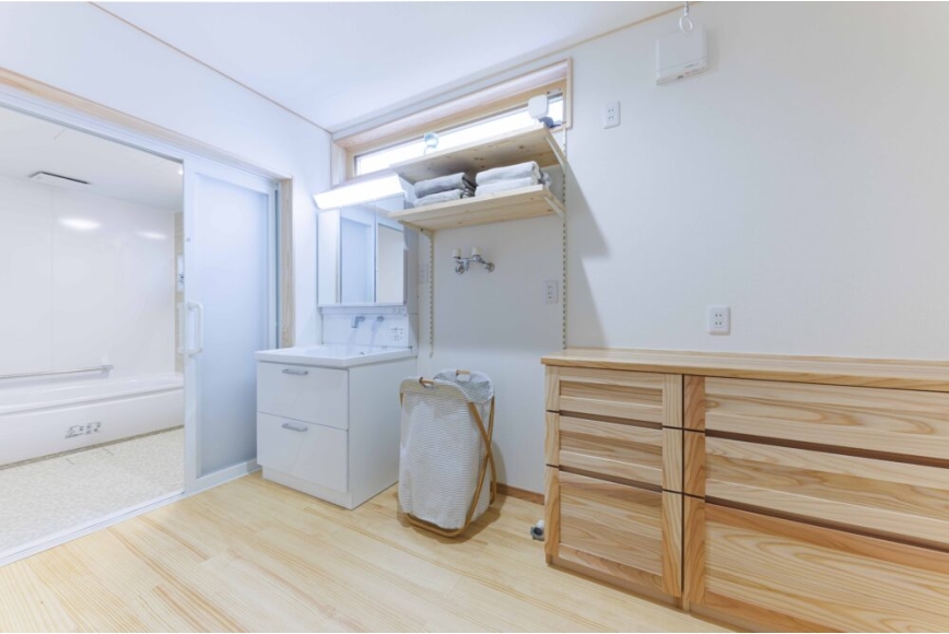 ●洗面脱衣室を広くして、物干しスペースを確保し、室内干しができるようにする